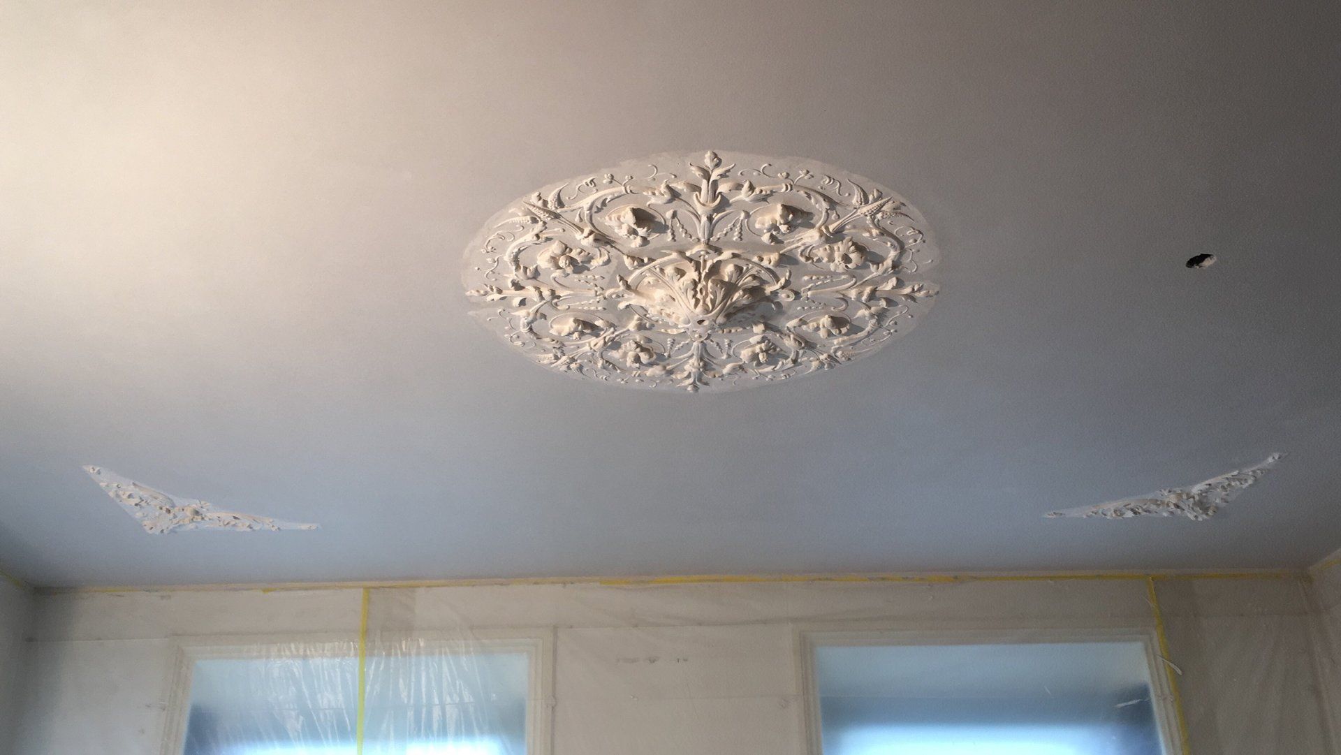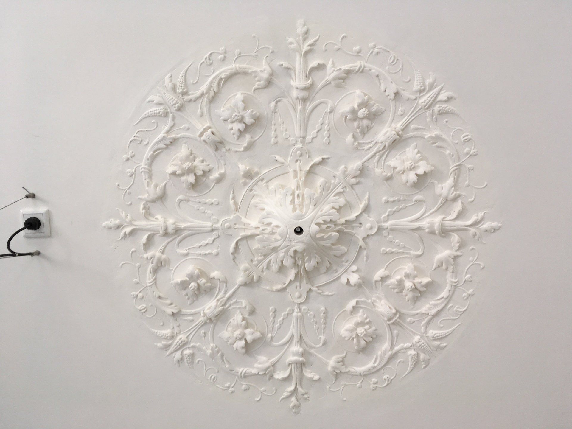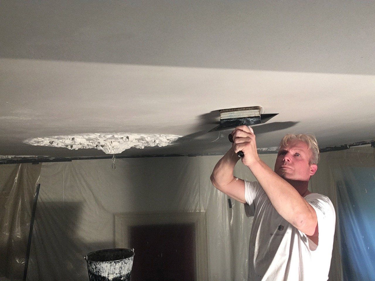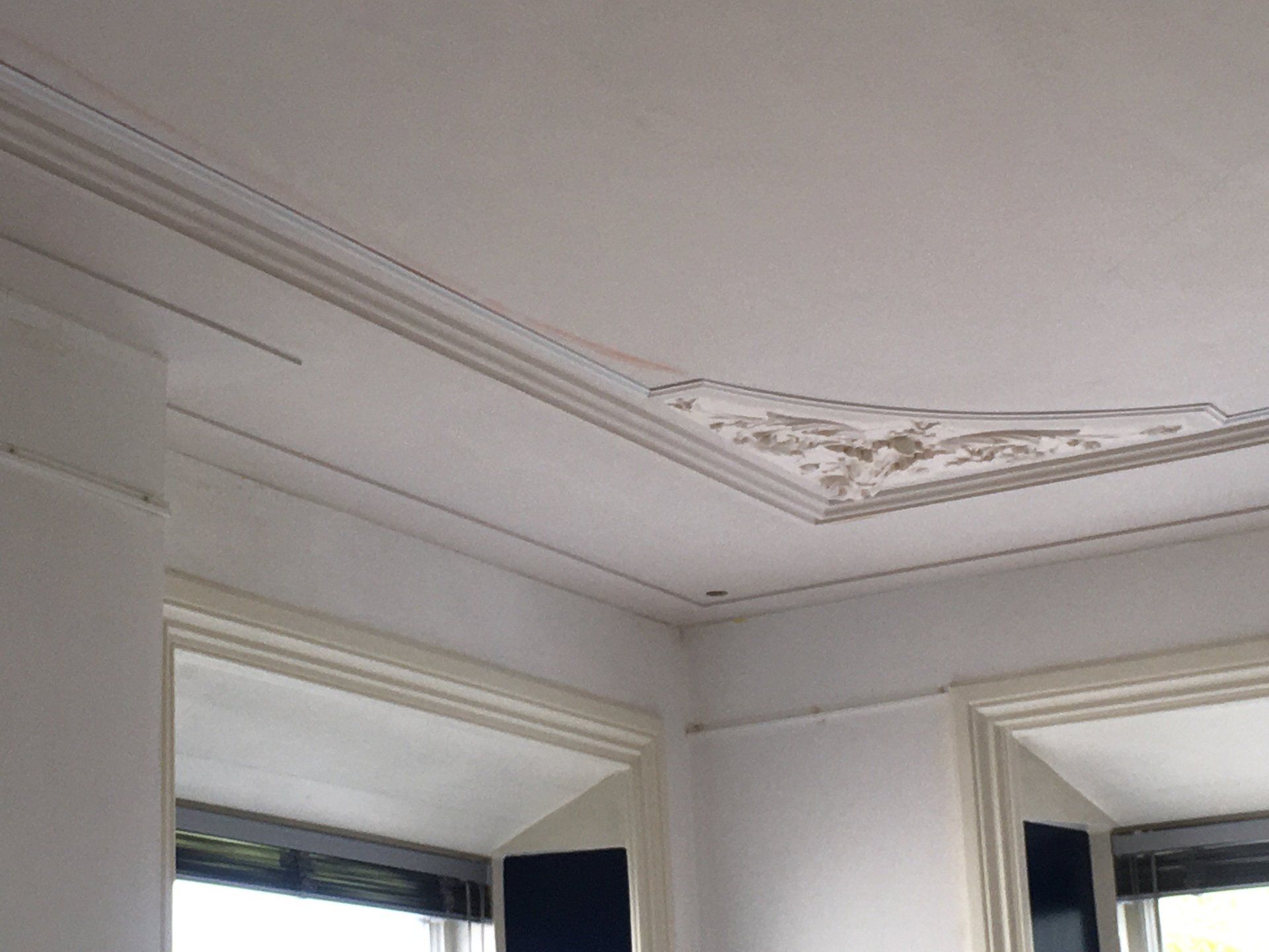 Als eerste verwijder ik altijd voorzichtig de ornamenten . Al snel werd duidelijk dat de stukadoor zelf de kopieen had gemaakt vroeger. De ene helft was origineel, en de andere helft was eigen kopie, ondanks best vreemd dat dit ornament uit veel losse delen bestaat. overigens aan de achterzijde van de delen was uiteraard te zien dat het om verschillende stukken ging .Het verwijderen van de oude verflagen was weer een hele klus op zich, uiteindelijk heb ik de meest mooie delen eruit gepikt en daarvan de nieuwe kopieen gemaakt.