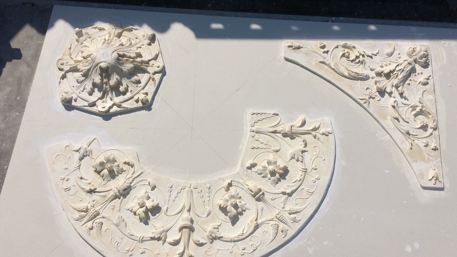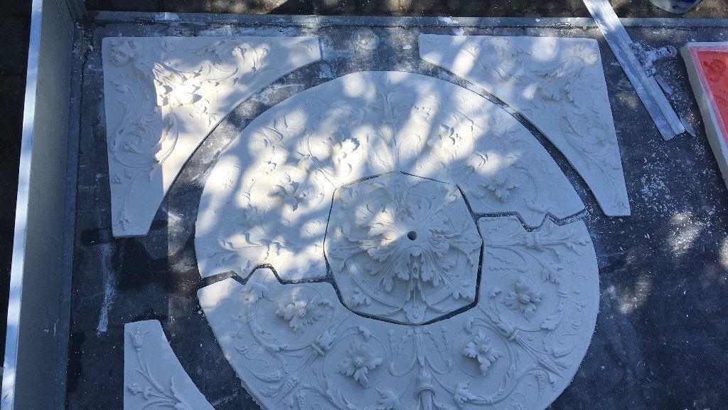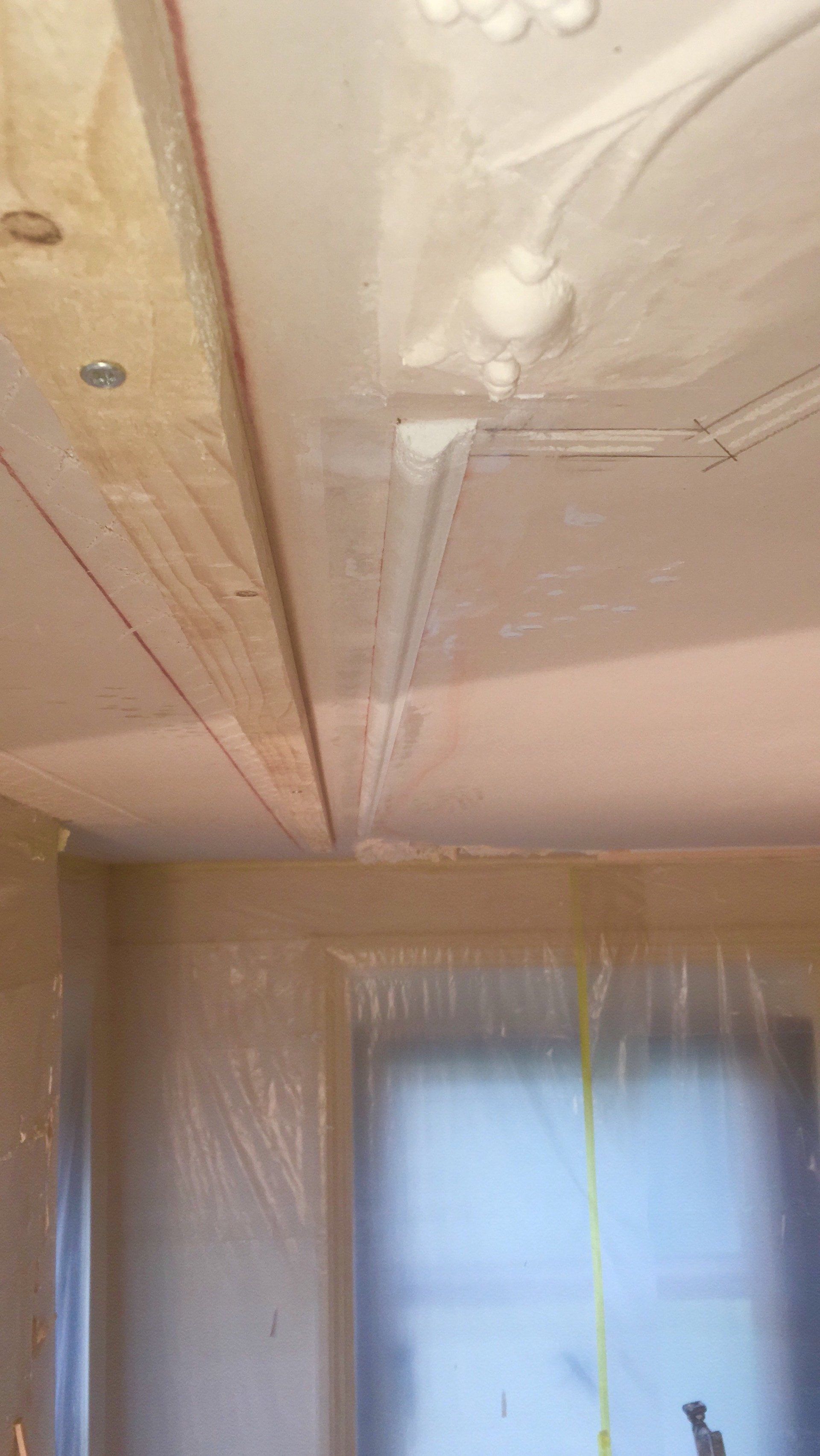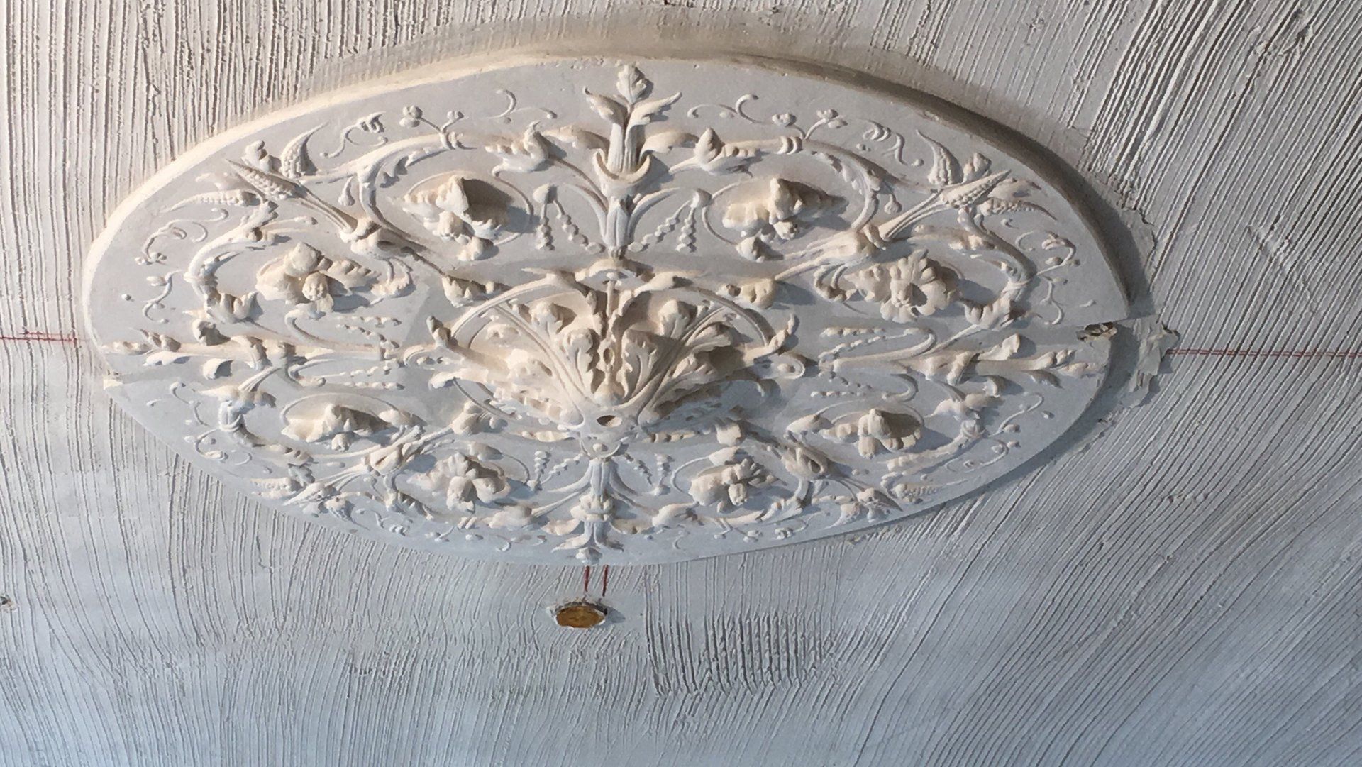Als eerste verwijder ik altijd voorzichtig de ornamenten . Al snel werd duidelijk dat de stukadoor zelf de kopieen had gemaakt vroeger. De ene helft was origineel, en de andere helft was eigen kopie, ondanks best vreemd dat dit ornament uit veel losse delen bestaat. overigens aan de achterzijde van de delen was uiteraard te zien dat het om verschillende stukken ging .Het verwijderen van de oude verflagen was weer een hele klus op zich, uiteindelijk heb ik de meest mooie delen eruit gepikt en daarvan de nieuwe kopieen gemaakt.
