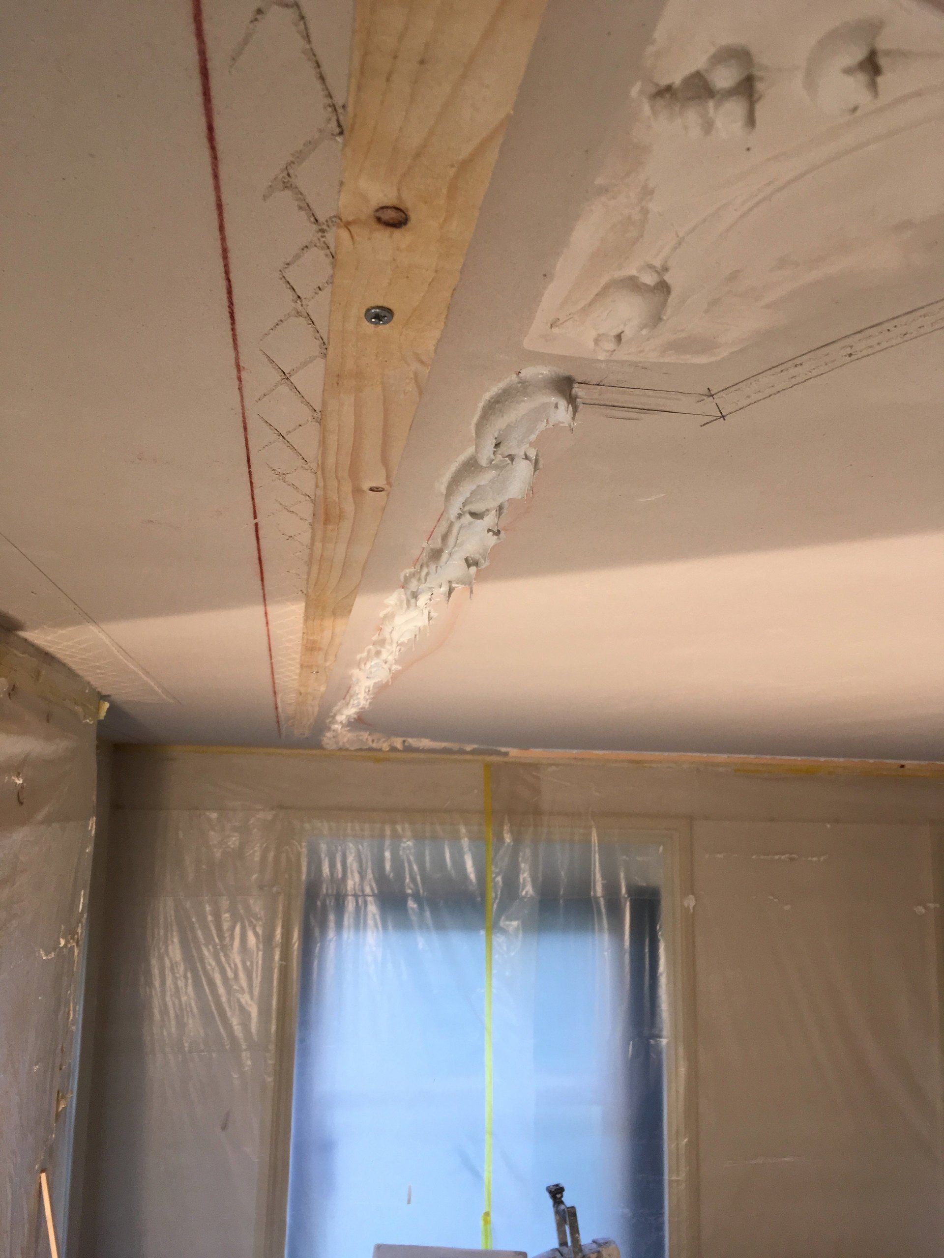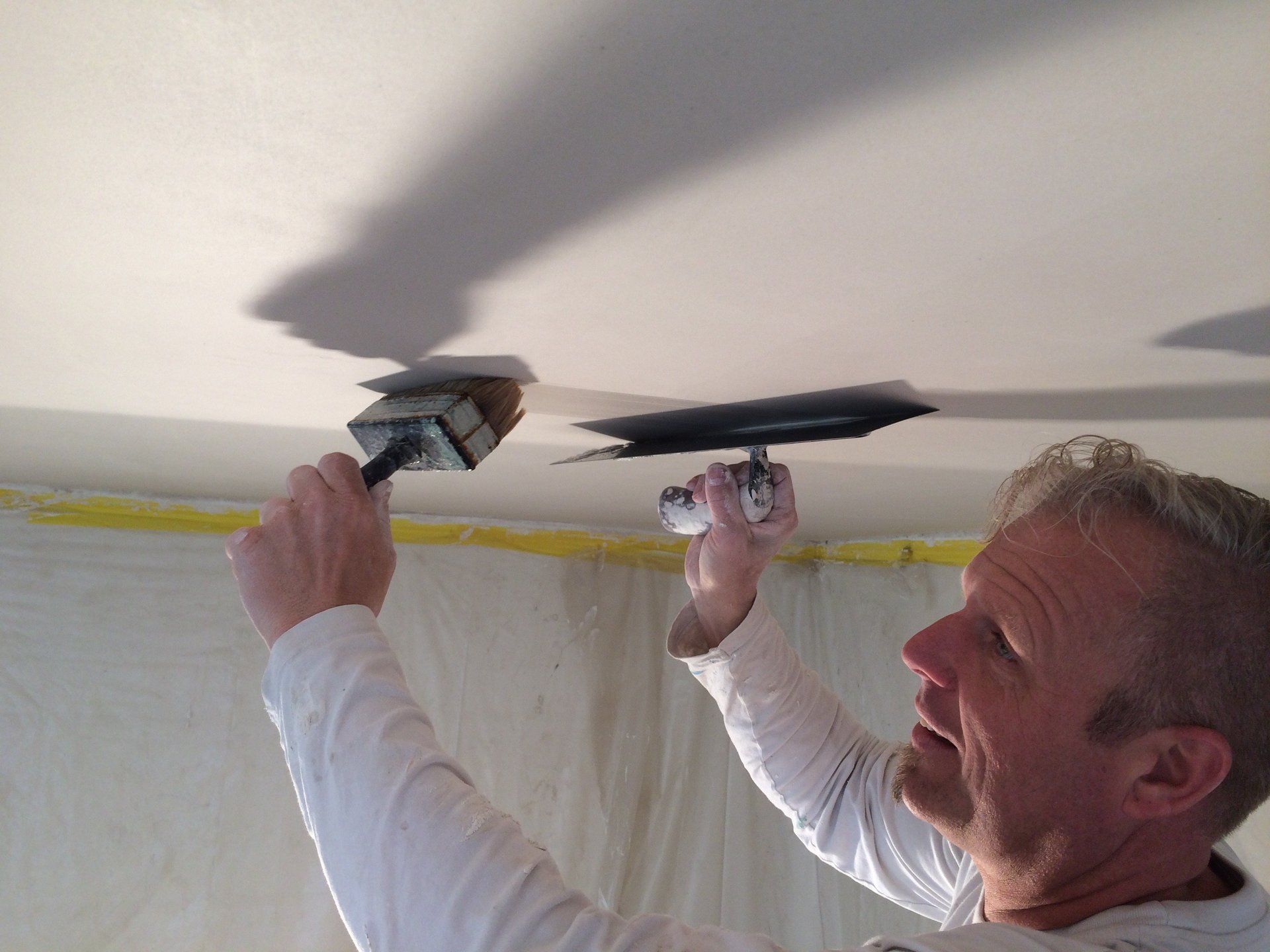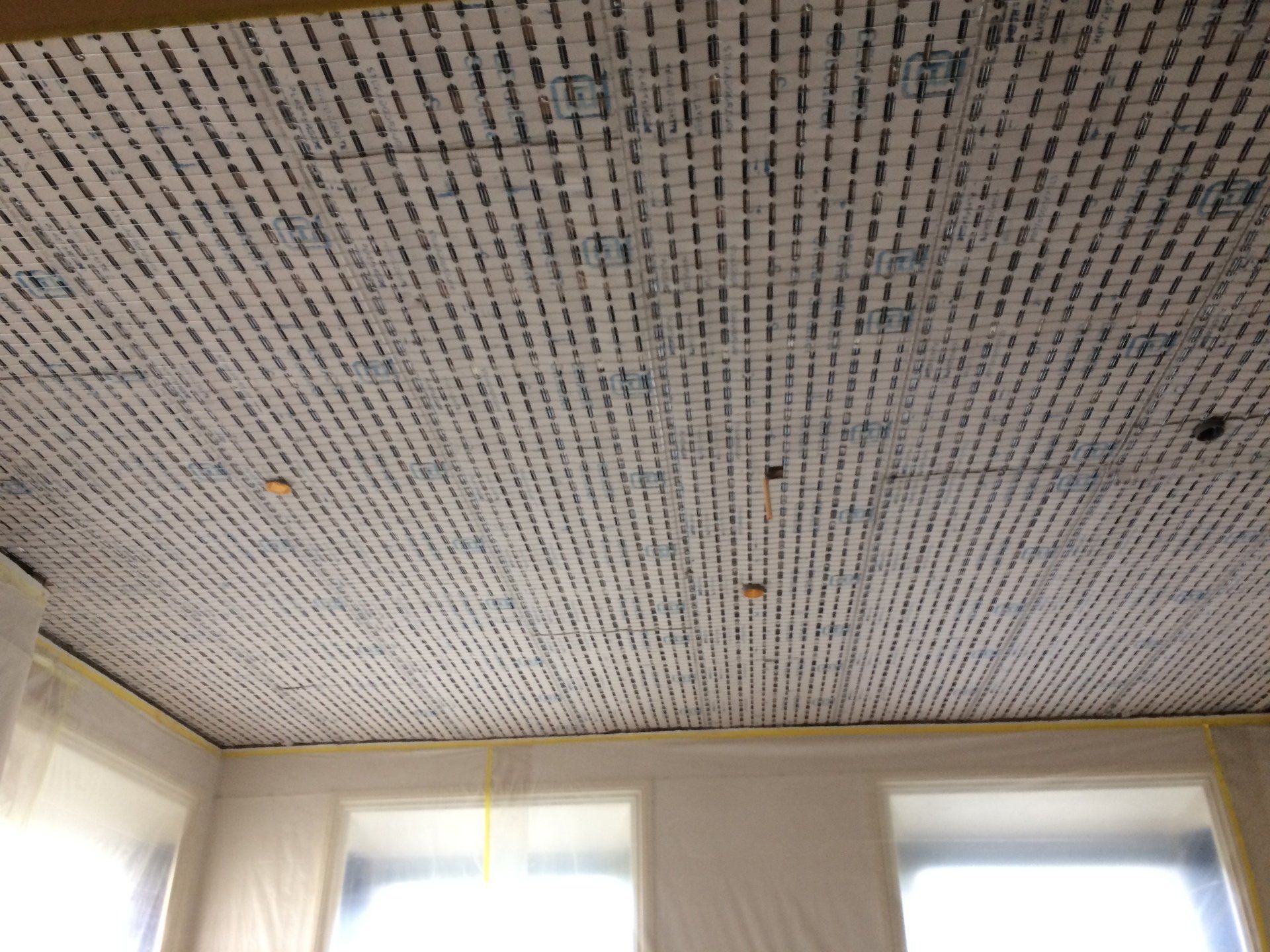 Nadat het riet was aangebracht werd hierop de, zoals we dat noemen ,vertinlaag aangebracht, deze vertinlaag bestond uit een kalkmortel/gips pleister. op deze laag werden de ornamenten geplaatst en daarna werd het hele plafond beraapt. Nadat deze raaplaag was uitgereid en dichtgeschuurd werd het plafond voorzien van een kalk/gipspleisterlaag, die daarna werd afgedoft met kalkwater. zoals men dat tegenwoordig ook wel noemt in 1 woord" stuc op riet"