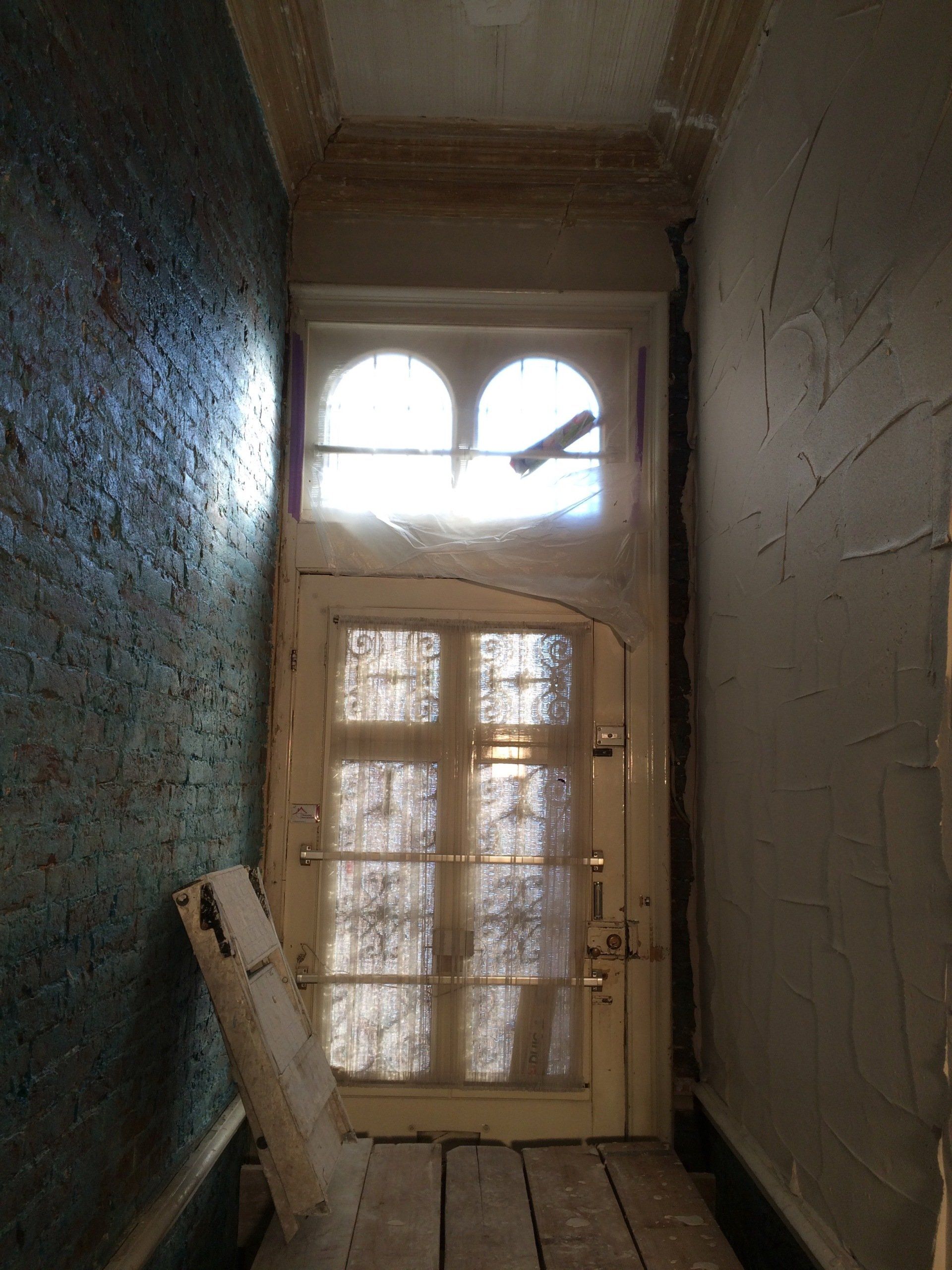 Nadat dit deel ook weer was voorzien van stukanet en een nieuwe stuclaag, de boog en de rest van de wanden zijn wel weer in de gips uitgevlakt en gepleisterd.