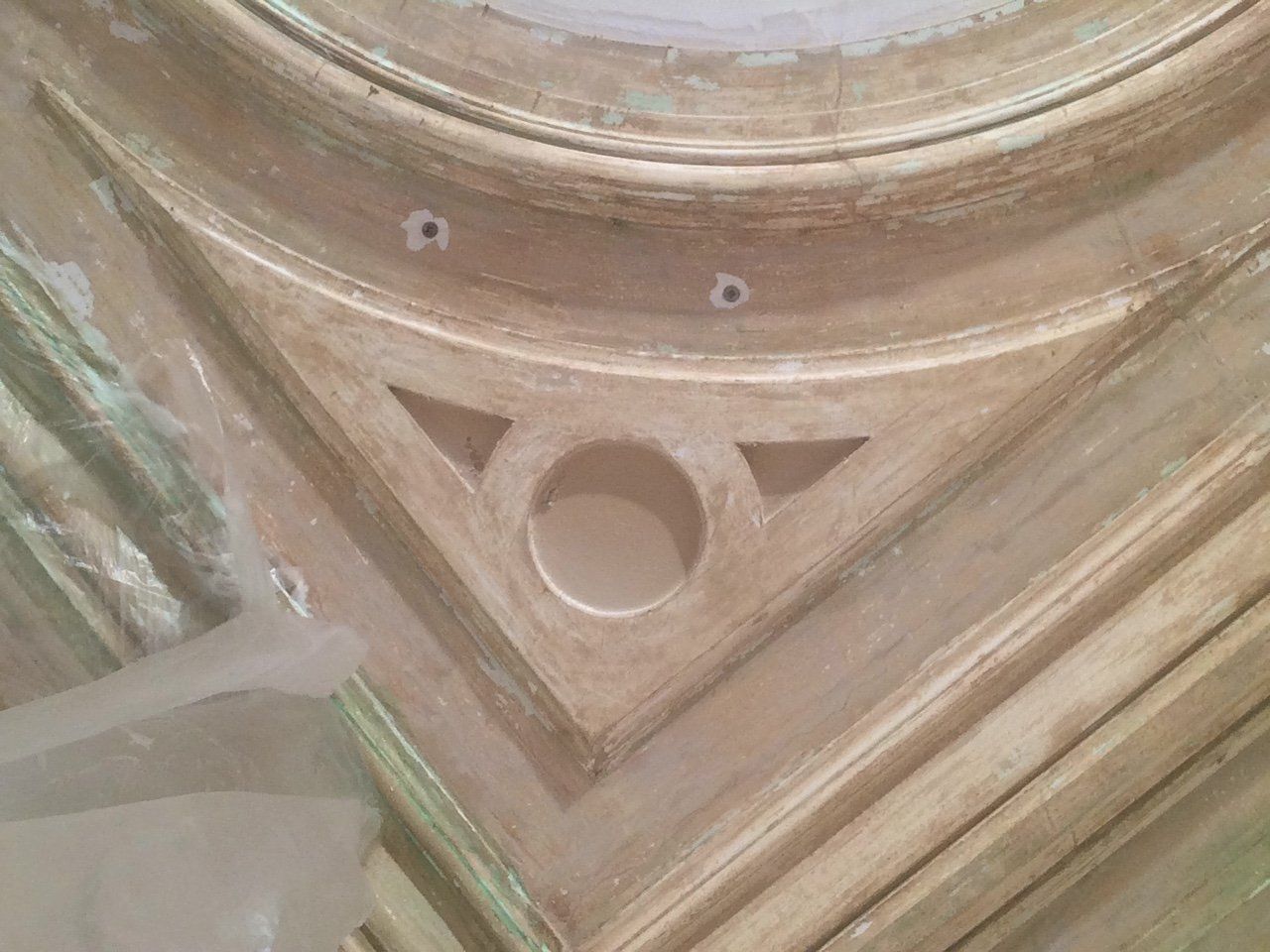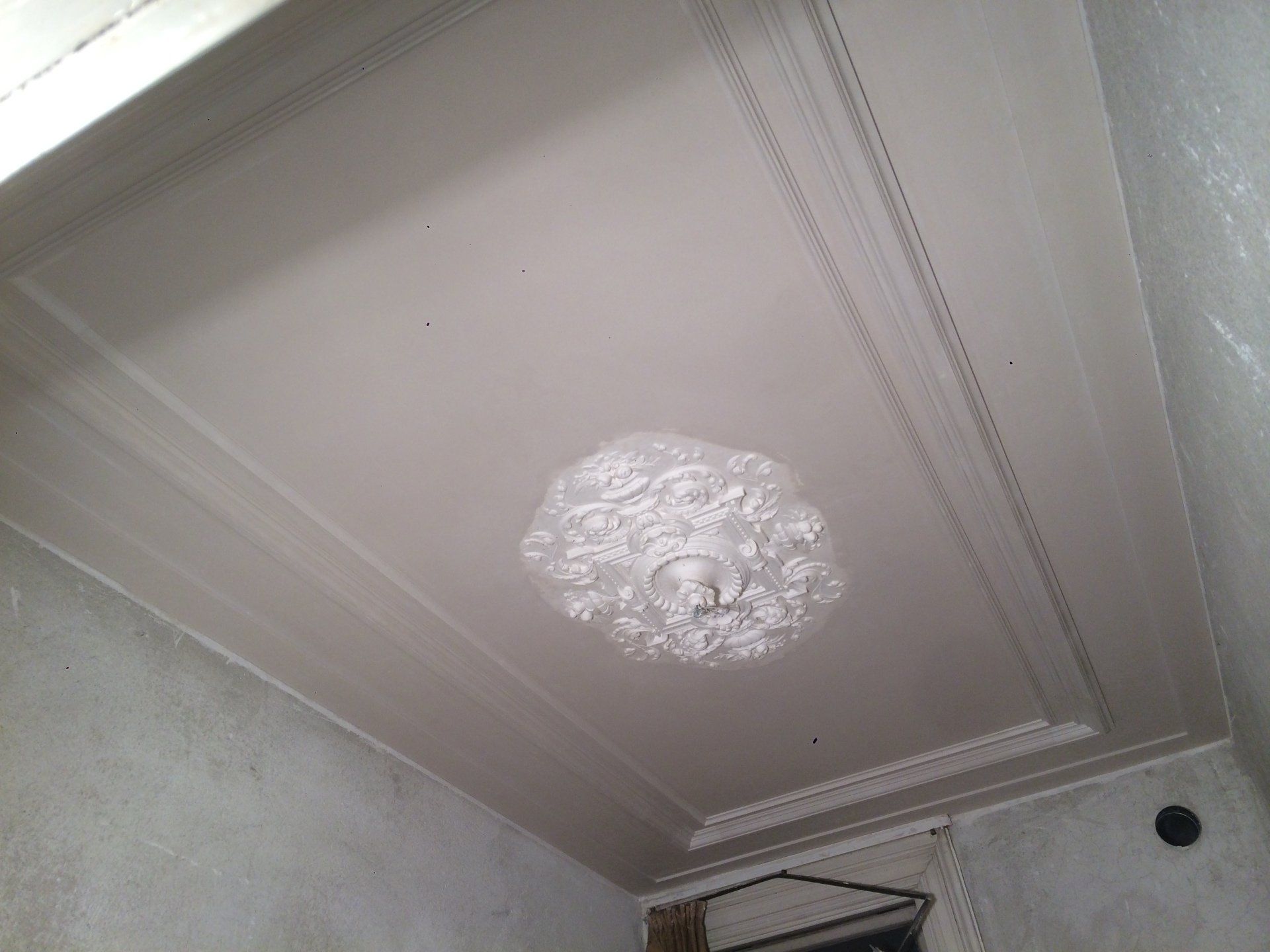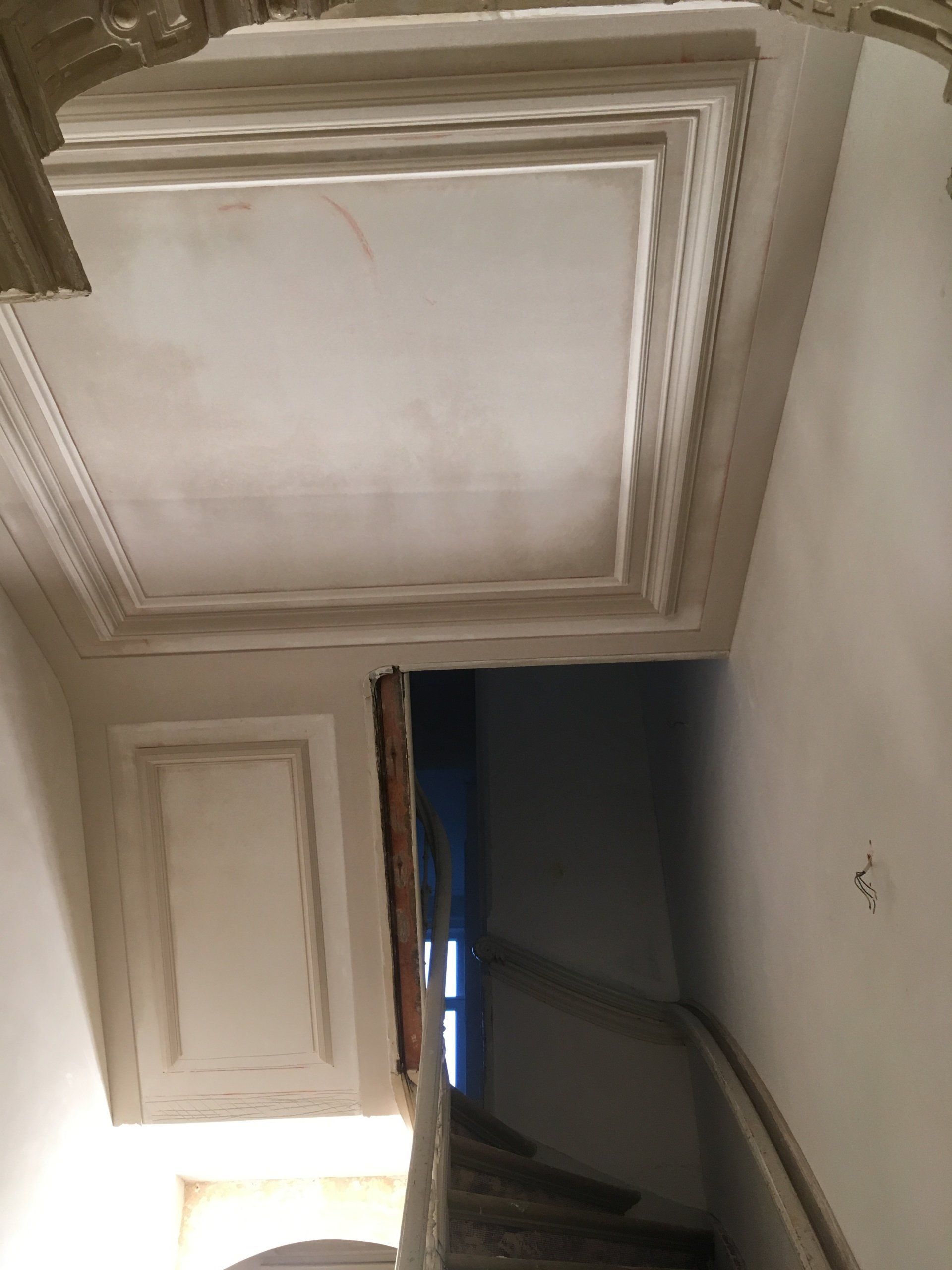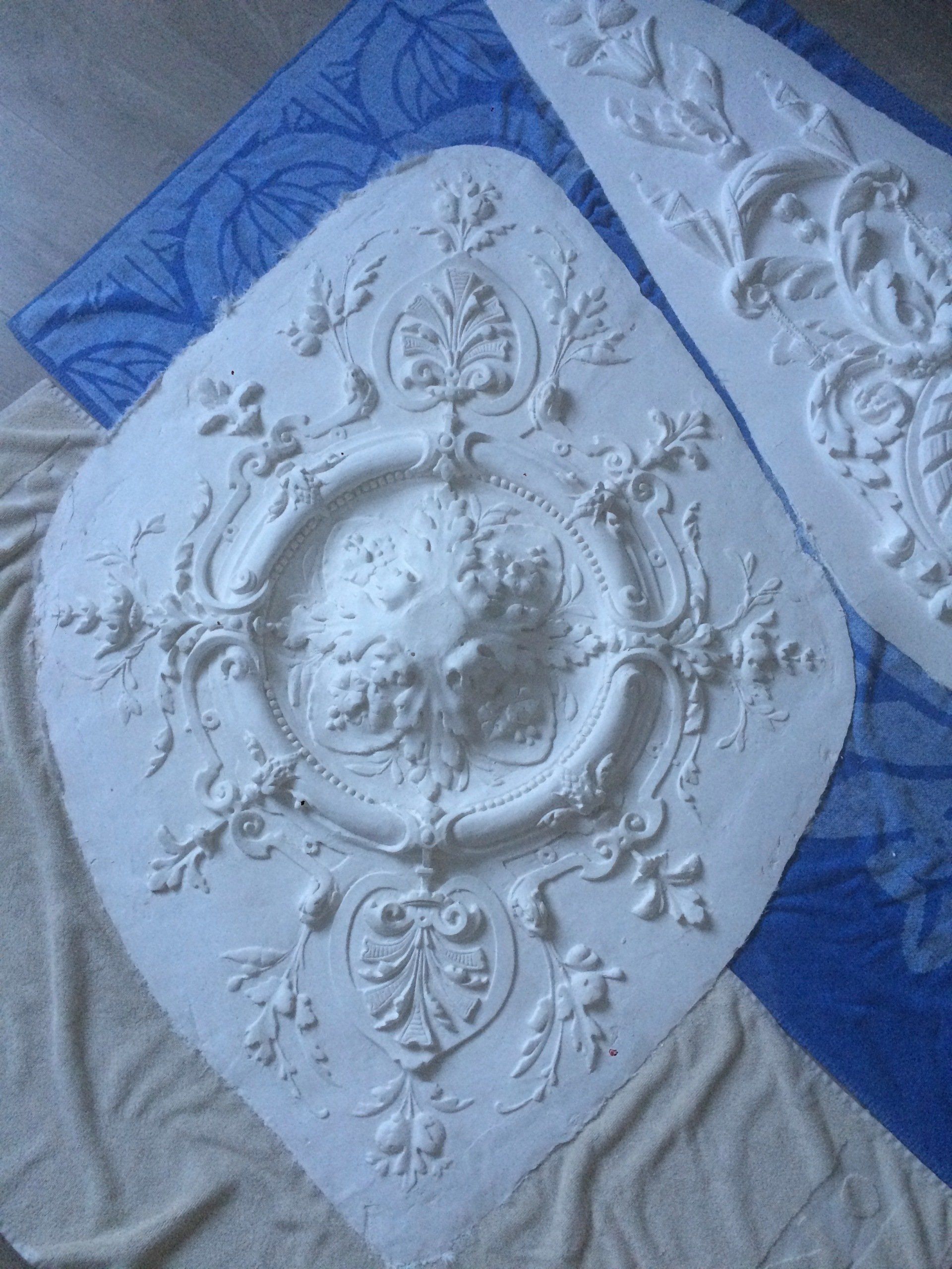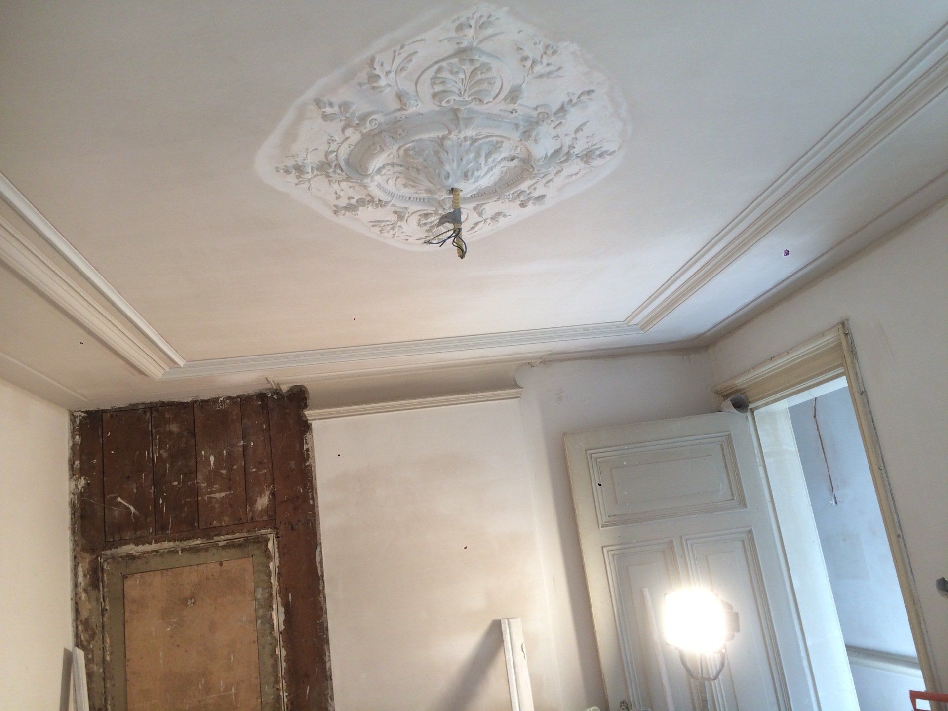 Nadat eindelijk alle verf van het plafond en ornament was verwijderd kon ik beginnen met het vastzetten van het plafond, vervolgens alles ontvet, scheuren uitgekrabd, gefixeerd en voorbehandeld , dit om een goede verankering te creëren .