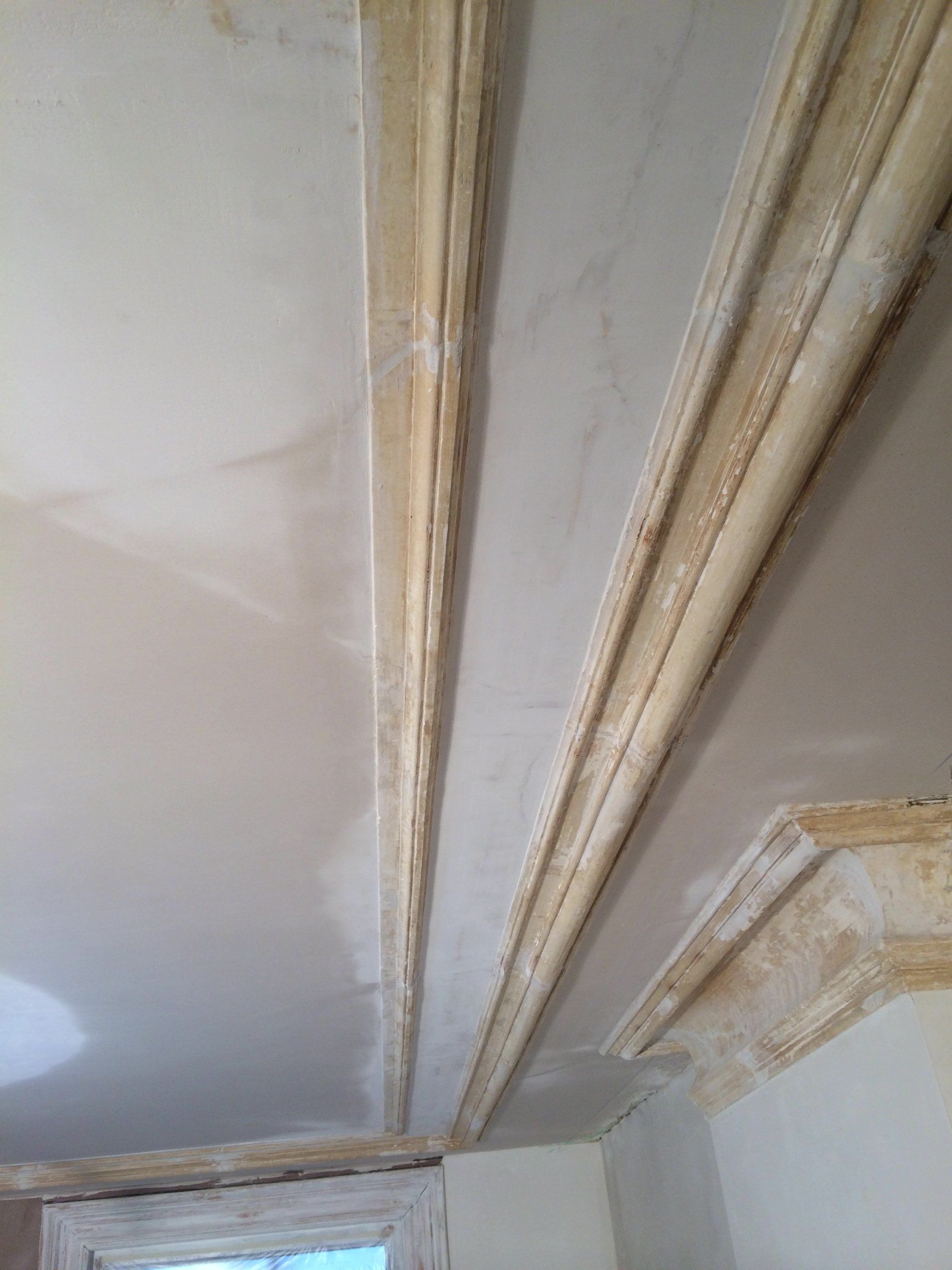 Tijdens het verwijderen van de oude verflagen van het plafond in de entree stuitten we weer op een nieuw probleem, een deel van het plafond voelde zeer slecht aan en uiteindelijk zijn we samen tot de beslissing gekomen om toch maar een deel van het plafond te verwijderen. Dit was wel een hele goede beslissing uiteindelijk, want we kwamen tot de ontdekking dat door een jarenlange lekkage een aantal vloerbalken totaal verrot waren , om overal goed bij te kunnen moest er wel een aanzienlijk deel verwijderdworden. Nadat we het ornament uit het plafond hadden genomen konden de heren goed in het plafond om delen van de vloerbalken te herstellen, gezien er zoveel uit plafond moest worden gehaald leek het mij wel net zo verstandig om het gehele deel tussen de kroonlijsten maar te verwijderen dit omdat het plafond zodanig was gescheurd dat een nieuwe constructie van stukanet mij geen overbodige luxe leek.